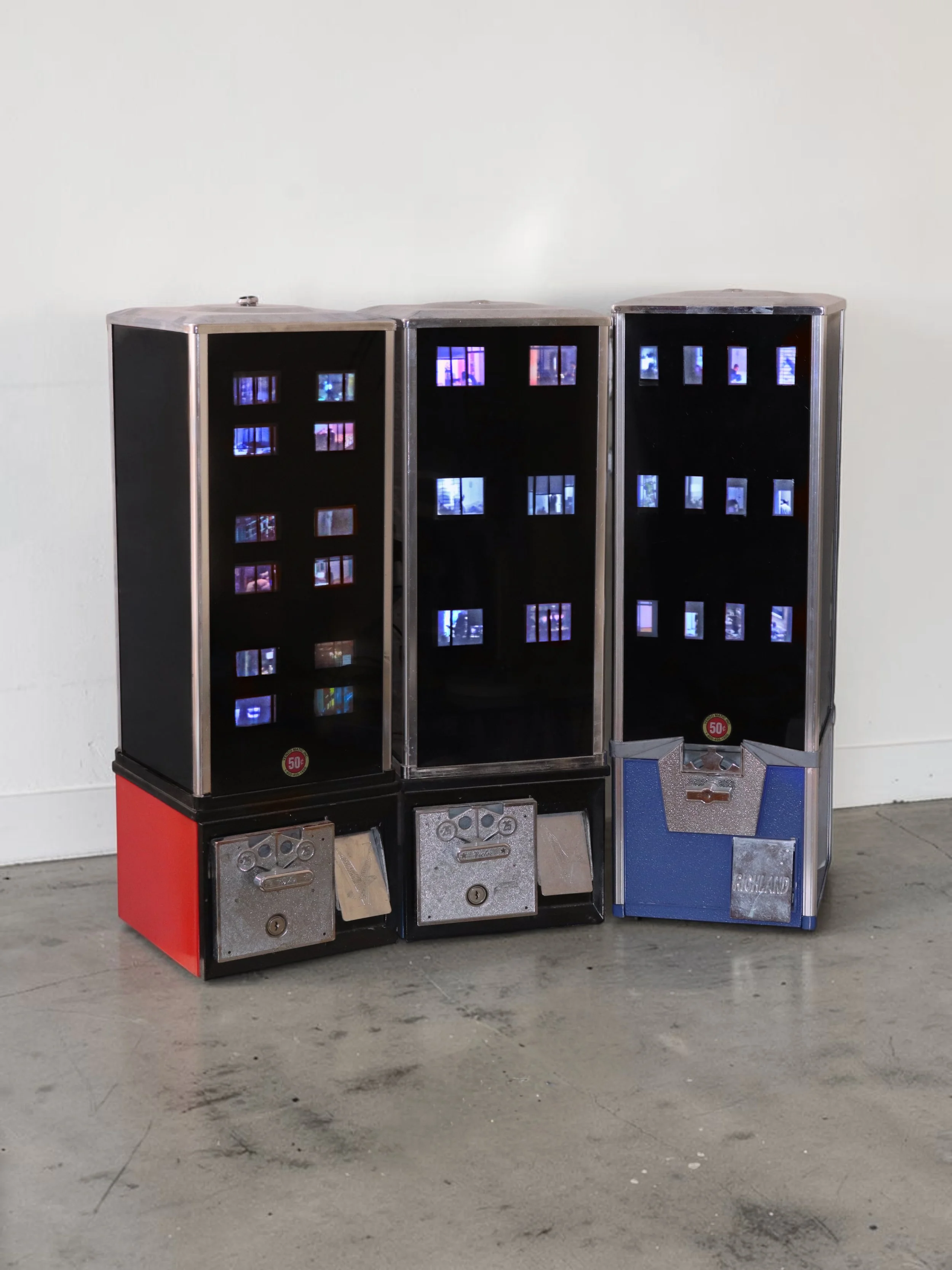 “Capsule Machines” (2023-2026) video and appropriated object installation. 18 2.5” LCD screens incorporated into three vintage quarter capsule vending machines, looping videos of publicly recorded apartment windows in New York, NY.